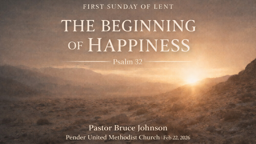 On Sunday, February 22, 2026 — the First Sunday of Lent, join us at Pender United Methodist Church as Pastor Bruce Johnson begins our Lenten journey with a message titled: “The Beginning of Happiness” (Psalm 32)